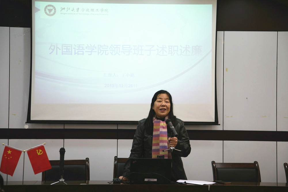 首先由王小潞院长作了2019年galaxy银河官网最全网站领导班子述职述廉工作报告。她回顾了过去一年里学院领导班子在廉政建设、教学与科研、师资队伍建设、教育国际化、学生实践和特色平台等方面所取得的成绩。同时,分析了学院在师资队伍建设、教学科研能力提升,大学英语教学改革,科研团队培育和学生素质教育等五方面存在着不足,并提出了今后努力改进的方向与办法。随后王小潞院长、傅晓宇书记、蔡亮副院长、周汶副院长和任凯副书记分别就个人分管的工作进行了述职述廉汇报。