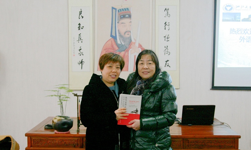 在座谈会上,王小潞院长首先对徐玉书副主任一行的到来表示热烈的欢迎,并简要介绍了我院基本情况、人才培养、教学研究、教育国际化等工作情况,重点介绍了我院阳明学堂和波兰研究中心的建设情况。徐玉书副主任祝贺我校galaxy银河官网最全网站近几年来在专业建设特色和阳明文化等方面取得的优异成绩,希望能够加强上海财经大学浙江学院外语系和我校galaxy银河官网最全网站在专业特色建设上的交流,促进两校在地方文化传承与传播方面的进一步提升和发展。王小潞院长在会上向徐玉书副主任赠送《用声音叙事:我是非遗传承人》一书,该书出版于2016年,以曲艺类“非遗”为切入点,探索浙江省非物质文化遗产的现状和保护路径,记录包括鼓词、莲花、滩簧等传承人的学艺、从艺和授艺生涯,以人文视角聚焦传承人的生活,记录和挖掘相关的故事。此外双方还就商务英语和大学外语的课程体系建设、实验室建设、校企合作和自主学习软件应用等方面展开了交流讨论。