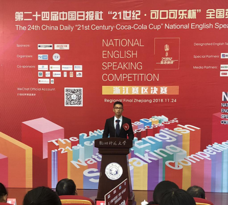 2018年11月24日,我校galaxy银河官网最全网站16级商英专业庄海一同学代表学校参加了杭州师范大学承办的第二十四届中国日报社“21世纪•可口可乐杯”全国英语演讲比赛浙江地区决赛,喜获二等奖。