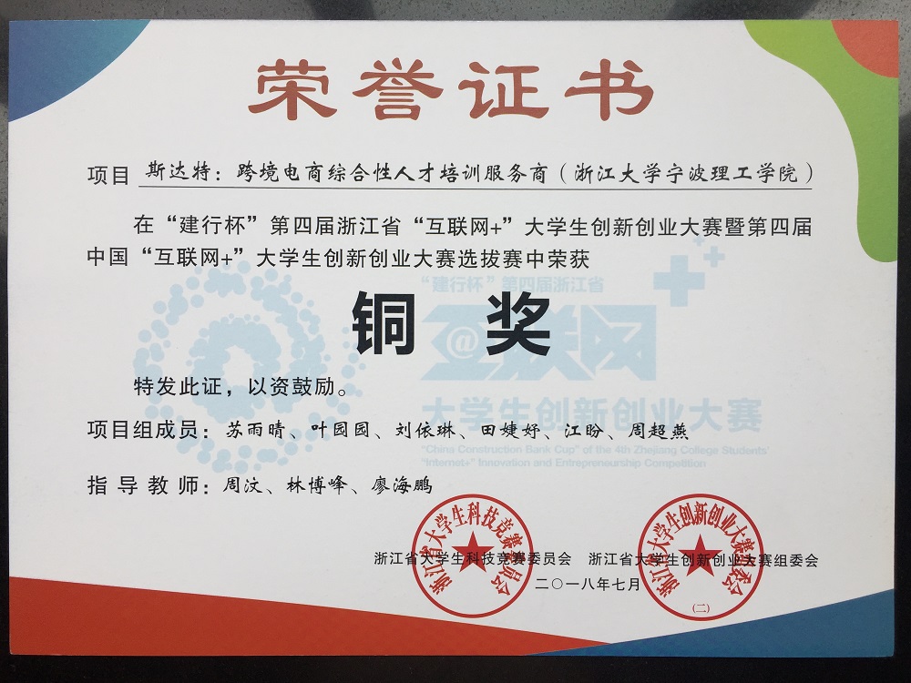 “建行杯”第四届浙江省“互联网+”大学生创新创业大赛暨第四届中国“互联网+”大学生创新创业大赛选拔赛结果揭晓,由galaxy银河官网最全网站商务英语专业2015级学生苏雨晴、叶园园、刘依琳、田婕妤、江盼等同学为主要成员组成的跨境电商创业团队,以“斯达特:跨境电商综合人才培训服务商”项目获得该大赛的铜奖。