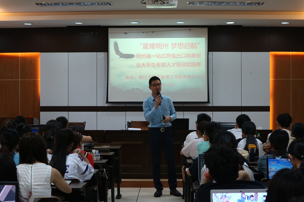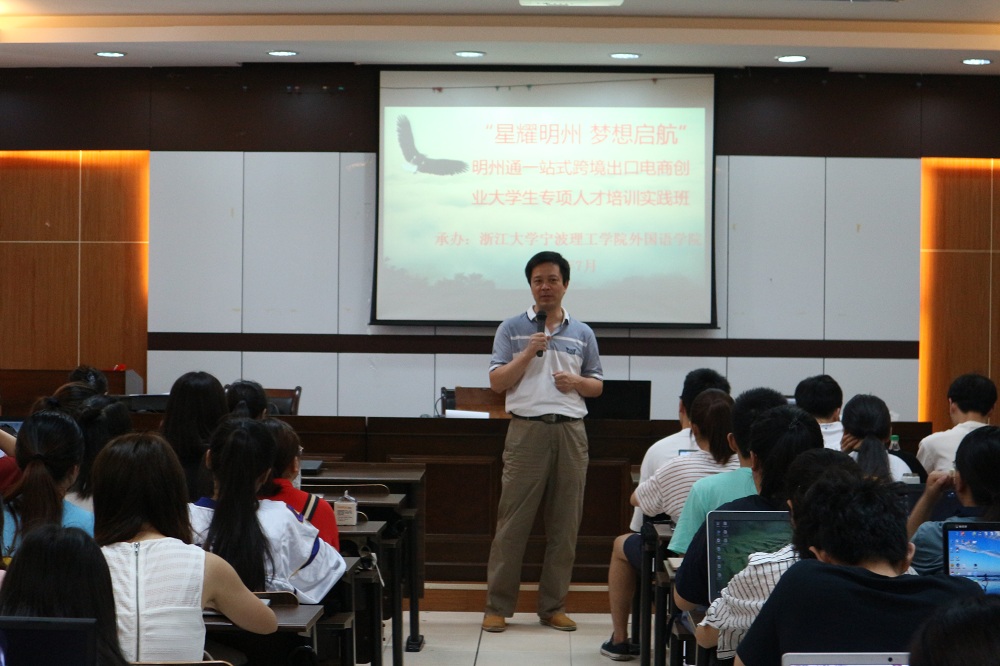 7月6日,明州通一站式跨境出口电商大学生专项人才培训实践班在教学楼SC405正式举行开幕仪式。本次开幕式由丁旭老师主持,参加本次实践活动的是来自商务英语、英语、日语、电子商务、国际贸易等多个专业、不同年级的76名有志学生。galaxy银河官网最全网站副院长周汶副教授和宁波观止电子商务创业园创始人林博峰总经理分别做了精彩的开篇发言。
