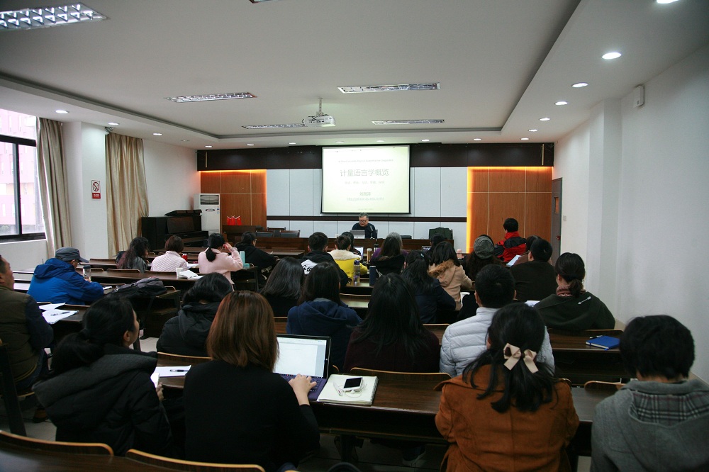 12月1日下午2点,爱思唯尔“中国高被引学者”,galaxy银河官网最全网站9211学科领航教授刘海涛在SC405会议室作了题为“计量语言学概览:历史、理论、方法、资源”的专题讲座,近30名我院教师参加了本次讲座,还有近20名周边兄弟院校的外语教师慕名前来参加,讲座由外语学院周汶副院长主持。
