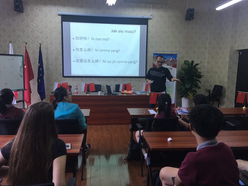 在课程伊始,阿图尔博士用英语向在座的中学生们简要介绍了我校波兰研究中心的基本情况,并向来自家乡的波兰学子分享了自己在中国的工作和生活经历。接下来,阿图尔博士分别通过波兰和中国的地图,绘声绘色地讲解着两国不同的地理、社会、文化等方面内容,同学们认真的听着、思考着,积极主动地举手发言,现场交流气氛活跃。在后面的语言课程中,阿图尔博士分别通过汉语和波兰语向大家讲授两国的日常礼貌用语,他认为在语言交流中使用具有尊重与友好的词语是尊重他人的具体表现,也是友好关系的敲门砖。在卜霄艳和黄伦玲两位老师的协作下,在场的30名中波学生分别尝试着用波兰语和汉语互相打起了招呼,在欢声笑语中,中波学生的友情得到升华,活动也达到了高潮。