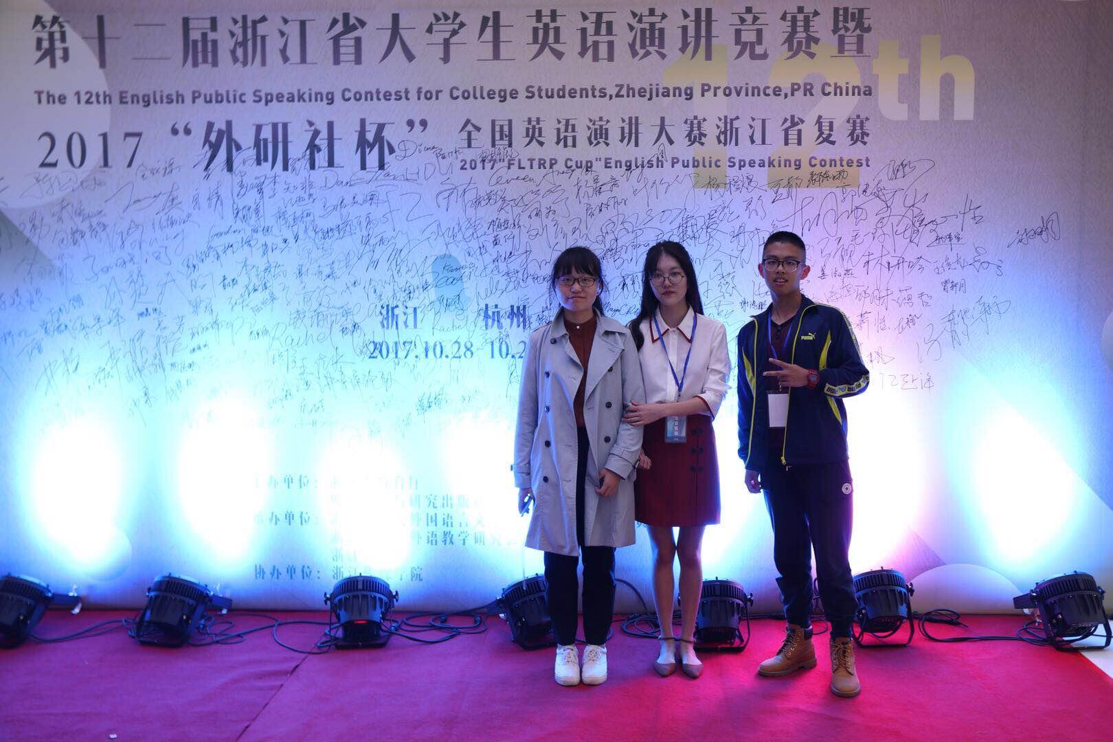10月27-29日,浙江大学宁波理工学院galaxy银河官网最全网站的庄海一同学和传媒与设计学院的金昕炜同学在英语专业周维老师的带领下,代表学校参加了由浙江传媒学院承办的第十二届浙江省大学生英语演讲竞赛暨2017年“外研社”杯大学生英语演讲大赛浙江省复赛。在两日的激烈比赛中,两位选手信心满满,展现自我,最终,金昕炜同学荣获三等奖,庄海一同学荣获优秀奖。