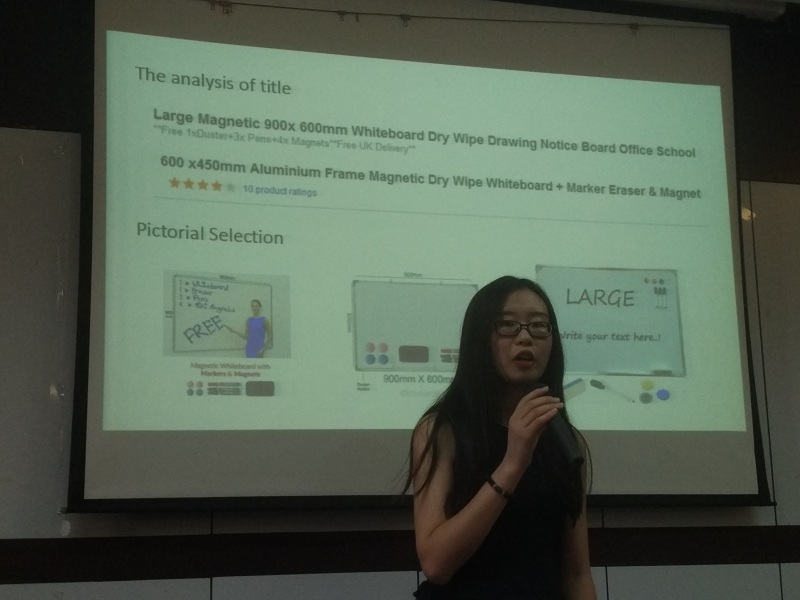 经过前期理论学习和实操演练,参加本次跨境电商人才培训实践的我院商务英语专业15级和14级学生共计67人分成7个团队,利用合作企业的丰富资源,对诸如千斤顶、健身器材、家具等在英国市场上需求量较大的产品进行了eBay平台的营销策划。同学们从竞争对手的调查、关键词选定、产品描述到定价策略的确定,短短一个星期,就实现了从最初方案的漏洞百出到最后策划案的成熟老到的蜕变。同学们的明显进步离不开全程悉心指导、无私奉献的企业导师:博辰(深圳)贸易有限公司销售总监李超红先生和宁波携纵电子商务有限公司市场总监毛吴涛先生。他们在电商领域丰富的实践经验为本次电商人才培训提供了质量保证。在下午的成果汇报中,以苏雨晴同学和江盼同学为组长的两支团队所做的策划案思路清晰、方法得当、策略合理、展示有效,被评为特等奖。叶园园同学的PPT展示仪态大方、口语标准,获得了大家热烈的掌声。