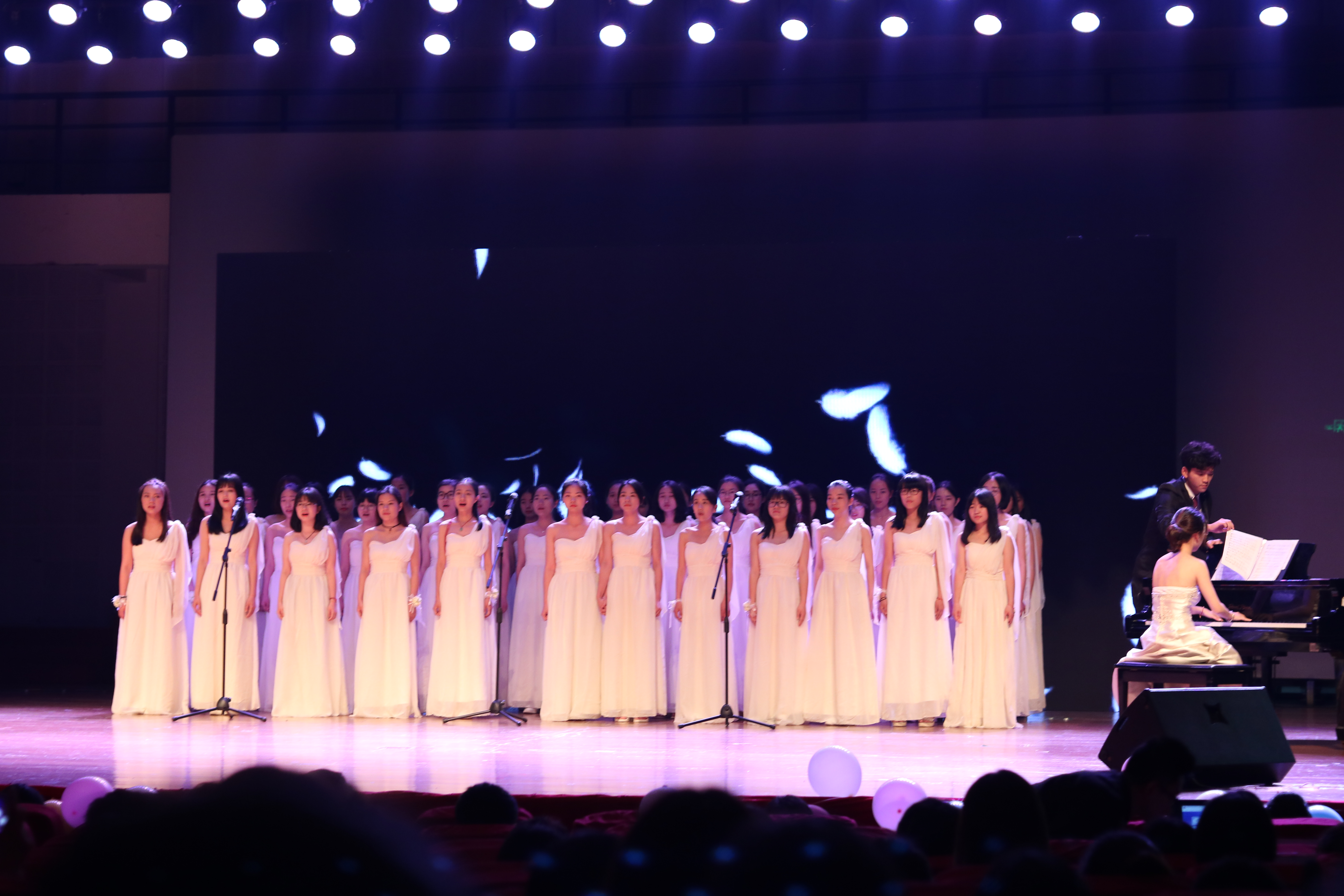 晚会开场,学院艺术团带来了精彩的开场歌曲表演,表现青春的热烈与张扬、优雅与独特。学院大学生合唱团60余名同学为毕业生送上了大合唱《送别》和《青春舞曲》,表达对同学们的惜别和不舍,同时祝愿毕业生们恣意潇洒,一切如意。晚会中,学院领导和老师们为同学们送上了毕业寄语,2015级的各班级为即将毕业的班助们送上毕业礼物,真诚祝愿学长学姐毕业快乐,学院党总支书记谌晓煜老师也为曾经活跃在“团学社”的优秀学生干部颁发了荣誉证书,表达学院对同学们默默付出的感谢与肯定。晚会中,辅导员韩晶晶、芦美丽、刘杜鹃和原团委书记刘杰为同学们分别朗诵了组诗《挡不住的青春》、《逍遥游》、《假如生活欺骗了你》和《相信未来》,希望同学们青春、自由、坚强、美好,常留理想在心间。晚会结尾,全体学生会成员带来了齐舞串烧《不要不要》、《大王叫我来巡山》和《功夫瑜伽》,场上场下互动热烈,气氛不断推向高潮。