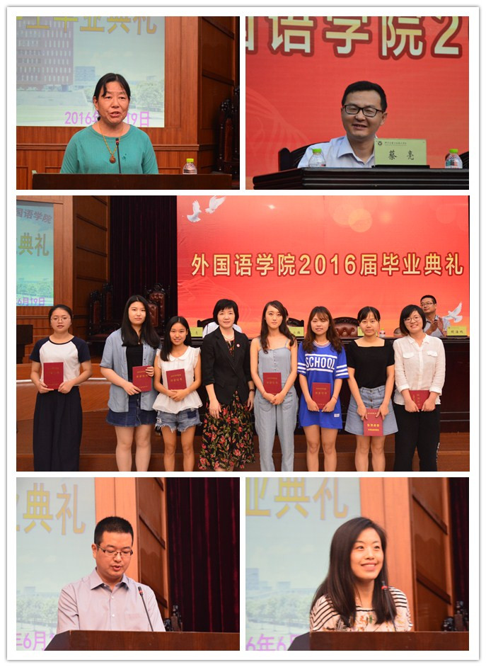 在发言席上,学院王小璐院长用全英文向全体毕业班同学致辞,她希望同学们永怀感恩之心,走出校园后在新的岗位上继续奋发努力,在未来的人生道路上飞得更高,走得更远;教师代表李飒老师用“仰望星空,脚踏实地”作为临别赠言,她希望所有的外语学子有时间还能来随园读读外语,在阳明学堂谈谈文化,喝喝咖啡,一切恍若昨日,一切充满希望;英语125班的李新新同学作为毕业生代表,在离别致辞中回顾了大学四年的生活,勉励学弟学妹们坚持奋发图强,学好外语并表达了对母校的感激和祝福;商英131班的章丽琼同学作为在校生代表向即将离开母校的学长学姐们表达最真诚的祝愿,祝福学长学姐工作顺利,记得常回理工看看,常回家看看。