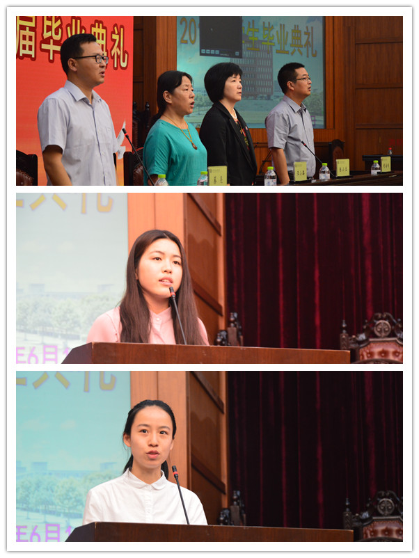 全体到场人员在齐唱国歌后,蔡亮副院长介绍了到场的嘉宾并宣读了整个典礼的议程,对于专程赶来参加学院毕业典礼的学生家长也表示了感谢。胡海鹏副院长宣读了2016届毕业生名单和省级、校级优秀毕业生表彰决定,校党委陈小兰副书记为优秀毕业生颁奖。