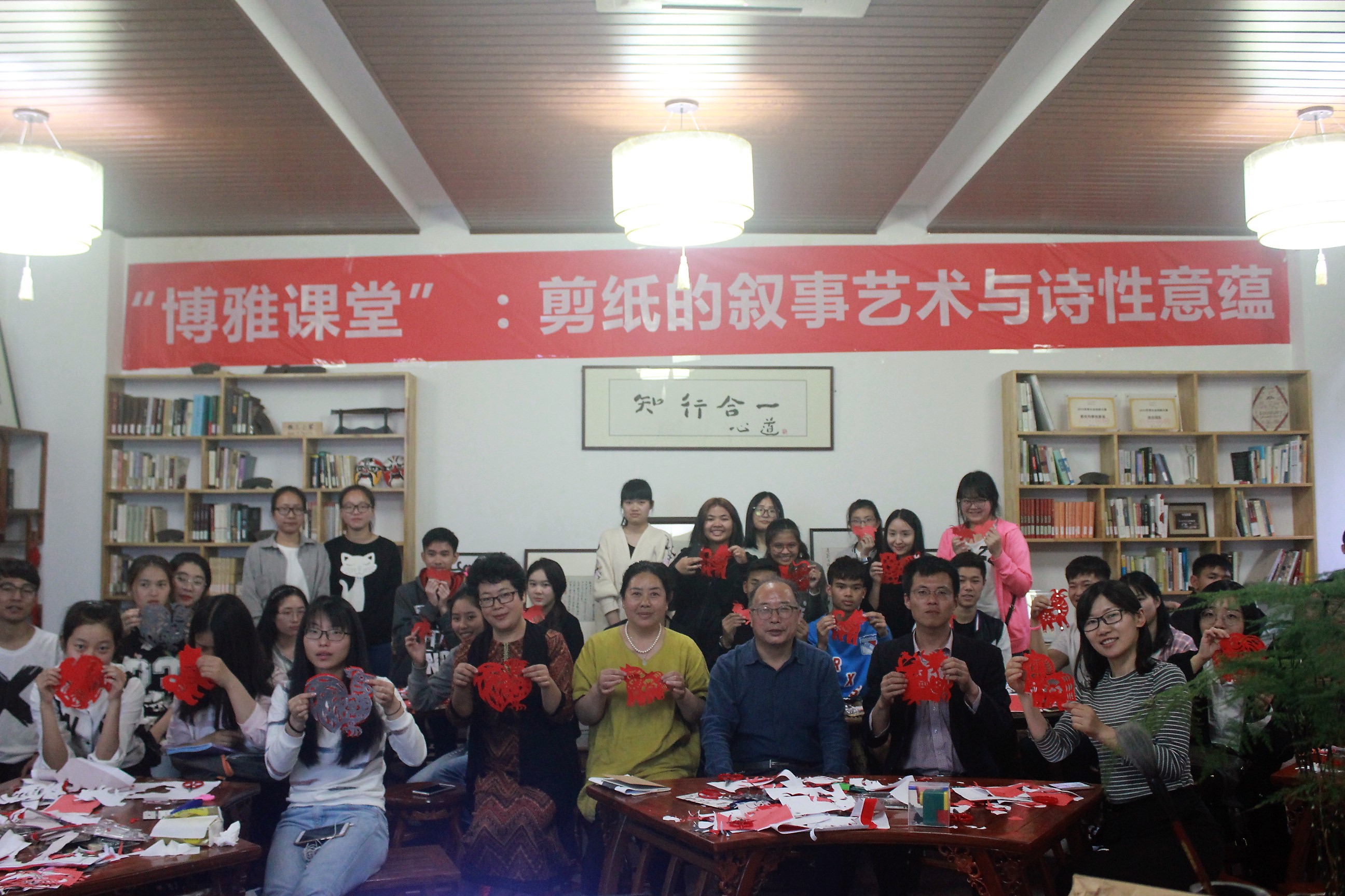 “镂金作胜传荆俗,剪彩为人起晋风”,这是唐朝诗人李商隐在《人日即事》中对剪纸的描述。剪纸是我国民间非常流行的一种传统艺术,被列入第一批国家级非物质文化遗产,它历史悠久,有着丰厚的生活积淀与底蕴,体现了中华民族的审美观念和情趣,具有鲜明的民族艺术特色。4月19日下午,宁波大红鹰学院的李建荣教授带着博雅课堂的学员和17名泰国朋友走进了剪纸世界。 “剪纸从哪里来?剪纸在向我们叙说什么?剪纸的灵魂是什么?...”讲座中,李老师列举了自己多年的田野调查发现,从符号学、叙事学、美学等多重维视角解读了剪纸这一非物质文化遗产,让现场师生理解蕴藏在中华民族文化深处的剪纸艺术的奥秘,表达自己对剪纸这一民间艺术的实践和思考。一把剪刀,几张红纸、七剪八剪,展开,是栩栩如生的飞禽走兽、生动活泼的故事传说……讲座中,现场的师生也体验了一把剪纸的乐趣,他们用剪刀和纸张,搭配独具匠心的色彩拼染和技法,表达对美好生活的祝愿。整场讲座内容丰富饱满、生动立体,充满了诗性意蕴,深深吸引了学员们的注意力,讲座也从原先的一个半小时延长到两个半小时,直到结束,同学们仍意犹未尽。 特别的是,本次讲座还迎来了一批“特殊”的学生,来自泰国的17名朋友在志愿者的带领下聆听了讲座。因为语言的不同,galaxy银河官网最全网站的潘灵芝同学还进行了现场翻译,一时间,中国文化、西方语言、剪纸、古朴典雅的人文建筑内涵,艺术美在阳明学堂交融碰撞,“博雅课堂”开始走上了国际化,正如李建荣教授所述“当一个大学开始这样做教育的时候,大学觉醒了,大学生被唤醒了。这只是一个简单的开始,但是已经走在知行合一的道路上。”