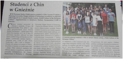 作为宁波市首批高校合作院校,浙江大学宁波理工学院海外实践团队对波兰密兹凯维奇大学进行了为期两周访学活动。 波兰方高度重视与我校的国际合作交流,格涅兹诺当地报纸和电视台到访密兹凯维奇大学“亚当欧洲文化研究院”,对项目负责人BeataFrydryczak教授和我校带队教师陈黎峰副教授进行了现场采访。媒体相关报道也于近日陆续推出,据悉,本次我校海外实践项目团队由galaxy银河官网最全网站和传媒学院共同组成。