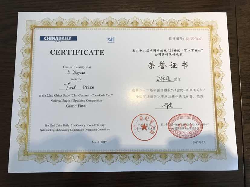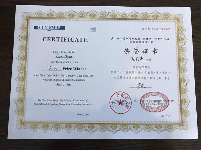 2017年3月24-26日,我校学子galaxy银河官网最全网站的厉修远同学参加了在南京大学举办的第22届中国日报社“21世纪.可口可乐杯”全国英语演讲比赛,获得全国总决赛(大学组)一等奖的好成绩,指导老师galaxy银河官网最全网站的阮巴燕老师获得全国指导老师一等奖。
