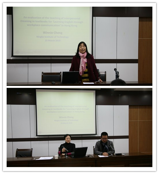 工作报告结束后,邀请了来自香港理工大学的Winnie Cheng教授(中文名:梁慧莲)进行了galaxy银河官网最全网站2016年春季学术讲座第一讲。Winnie Cheng教授是香港理工大学人文学院副院长,英语教授,博士生导师, 国际著名的“特殊用途英语研究”专家。讲座伊始,胡海鹏副院长对Winnie教授进行了介绍并对其表示热烈的欢迎。本次讲座的题目是“An evaluation of the teaching of interpersonal meaning in textbooks for ‘Learning English through workplace communication’ in Hong Kong”。 Winnie Cheng教授提出英语在国际化环境中,尤其在职业交流中起到了维持社会和人际关系的功能。 她分析了香港中学生现行的四本职场交际英语课本的文本,发现在四个方面(立场表明、遁言与礼貌、表达与共建已有知识、团结表达方式),不同的教科书所使用的语言策略与表达方法各不相同,而且在不同的文体中,如口语和书面语也存在较大差异,最后Winnie Cheng 教授以商务英语中的Email书写的得体性为例阐述了此研究的理论和应用价值。