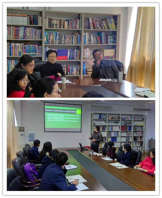 英语学术写作的教学与研究一直是外语学界研究的热点之一。首先廖佳栋博士就学术英语写作中的“简洁性”为题向大家汇报了其近期研究成果。对于母语为非英语的学生,在写作过程中他们倾向使用大量简单的词语与语句,这些简单的词语与语句经常出现在英语口语的表达中,而不被学术英语所接受。廖佳栋博士介绍了学术英语写作中如何做到“简洁”同时又能被西方学界所接受的方法。Winnie Cheng教授充分肯定了廖博士的研究成果,但也同时提出为了提高研究的充分性和客观性,可以通过语料库的定量研究方法加以完善。在交流过程中,孙广平副教授和芦俊燕副教授以平时在英语教学过程中的一些英语学术写作教学经验,作了一系列的补充。此外,研讨会中也有多位年轻教师介绍了自己近期的研究,如李辉老师的心理词汇研究、阮征老师的大学英语微信教学交流平台研究、李飒老师的商务英语教学研究等,Winnie Cheng教授在认真听取了问题后对她们一一做了细致耐心的答复,整个研讨会充满着浓浓的学术氛围。