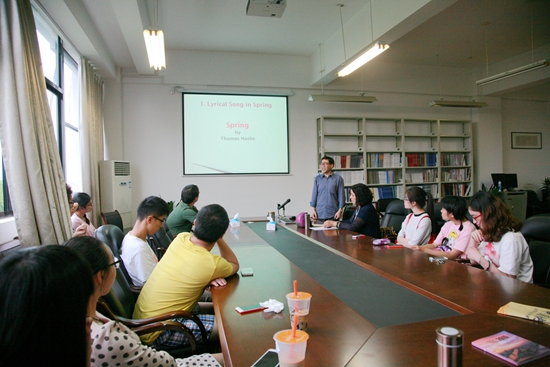 接下来,魏建老师与我们分享那些深情而华丽的诗歌,并邀请在座的同学朗读诗歌,通过声音的流淌让人感悟那文字背后的真情。“Spring, the sweet Spring, is the year’s pleasant king,Then blooms each thing, then maids dance in a ring.Cold doth not sting, the pretty birds do sing,Cuckoo, jug-jug, pu-we, to-witta-woo! ”这是一首描写春天美好的诗,大意是“春,甘美之春,一年之中的尧舜,遍地都有花树,到处少女环舞,微寒但觉清和,百鸟争鸣唱歌,Cuckoo, jug-jug, pu-we, to-witta-woo!”而这一小节诗的末尾还用了拟声词,仿佛真能听见百鸟鸣叫的声音,沉醉在春天浪漫的气息中,温暖而舒适的春风迎面而来,带来花的芬芳,清脆的鸟声,是那么的美好!在同学的朗读中,魏建老师也传授了读诗歌的方法,学会轻重缓急,富有感情的朗读,不仅让自己能体会诗中的美好,还要将这份美好传递给他人,唯如此才能更好的去领悟诗中的世界。