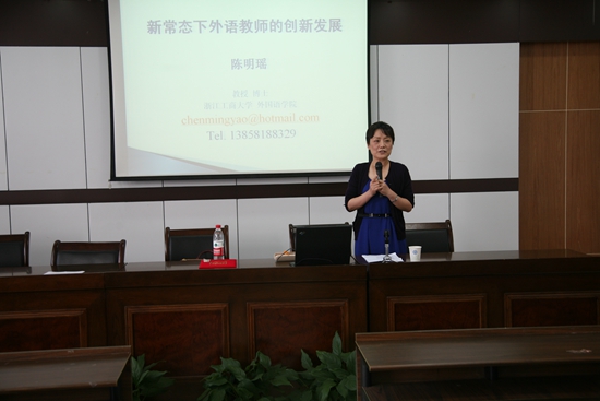 2015年5月22日下午,浙江工商大学陈明瑶教授应邀在galaxy银河官网最全网站SC405会议室为学院全体教师作了《新常态下外语教师的创新发展》的专题讲座并受聘担任学校的兼职教授。聘任仪式由galaxy银河官网最全网站副院长胡海鹏副教授主持,学校人事处朱苏永副处长、学院谌晓煜书记和蔡亮副院长出席了仪式。 首先,朱苏永副处长对陈明瑶教授的到来致欢迎辞,并宣布了聘任陈明瑶教授为我校galaxy银河官网最全网站兼职教授的决定。随后,谌晓煜书记代表学院向陈教授颁发了聘任证书和赠送了校徽。谌书记在介绍陈教授的时候感慨万千,陈明瑶教授曾于我校建校初担任过外语系(galaxy银河官网最全网站前身)的第一任系主任的职务,她当年为了这个系未来的建设和发展付出了辛勤的劳动和汗水,虽然整整过去十多年,她依然记得讲台下当年那批意气风发的青年教师的名字,她家里依然保留着当年那块宁波理工学院的校徽。看到当年十多位教师的外语系发展成为80余名教职工,800多位专业学生,承担全校万名学生大学英语任务的galaxy银河官网最全网站,她对大家这些年来的努力表示了赞扬和肯定,并表示自己受聘为兼职教授后一定会和大家一起为学院的事业发展努力。 讲座伊始,陈教授便以数据说话,她通过一系列经过统计的数字,简要概括了当前外语教师生存发展现状,引发了大家的深刻思考。接着陈教授以教育、职业、体制等当前外语教师发展中所存在问题的因素进行了分析探讨,她提出:外语教师的创新发展是解决这些问题的根本对策,要实现英语教师的创新发展,教师首先要确定自己的学科和专业领域,并在研究内容、研究方法、专业实践等领域进行创新。讲授中,陈教授结合自己目前正在做的研究项目为例,向大家诠释了外语教师申报创新研究课题的真正意义,并给出了具体使用的指导意见,拓宽了大家的思路。陈教授谈笑风生,幽默睿智,通过大量的实证案例,引发思考,老师们感到深受启发。 陈明瑶教授端庄干练、气质优雅,但她治学的严谨,学术的成就更令人钦佩。近些年来,她在一级、核心刊物上发表学术论文30余篇,出版专著3部,字典2部。 主持或参与完成二十余项国家级、省市级科研项目。galaxy银河官网最全网站一直十分重视聘请校外知名专家和学者担任兼职教授,帮助中青年外语教师们的学术成长。今后陈教授将给我校中青年外语教师在科研、教学等领域给予专业指导,相信对galaxy银河官网最全网站的专业建设、学科发展都起到重要的作用。