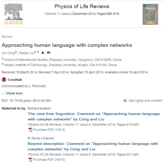 刘海涛教授团队这次能受邀为PLREV撰写有关语言复杂网络的review,主要得益于多年来他们已在本领域所取得的多项国际领先研究成果,也是该团队多年来坚持采用跨学科研究方法研究语言的结果,是我院在这一研究领域国际领先实力的展现。为他们的review撰写评论的有国际著名语言学家Richard Hudson、著名的语言复杂网络的研究者Ramon Ferrer-i-Cancho博士、著名计量语言学家Reinhard Köhler教授以及多位相关领域的知名学者,充分展现了这一研究领域的广阔前景与应用潜力。