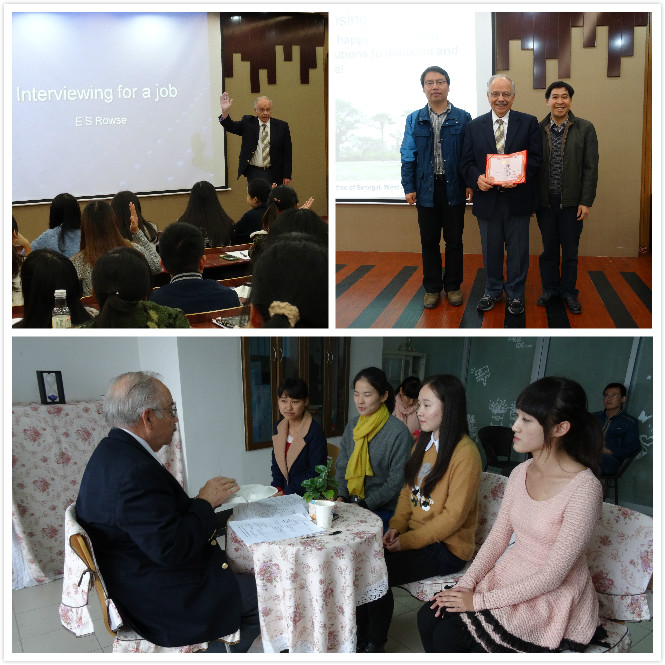 主讲嘉宾Edward Rowse先生今年72岁,连续10年在中国从事职业生涯规划公益讲座,曾任美国财富500强杜邦公司高级工程师,先后在ADM,Metabolix等公司担任高级管理职务。讲座中Ed Rowse先生先给在座的同学们介绍了“what is good interviews and bad interviews?”,他并未以我们熟知的成功人士为例,而是结合自己的亲身经历为大家分享,同时也演示了面试时怎么敲门,怎么丰富的介绍自己,怎么给面试官留下深刻的印象等细节,令同学们受益匪浅。