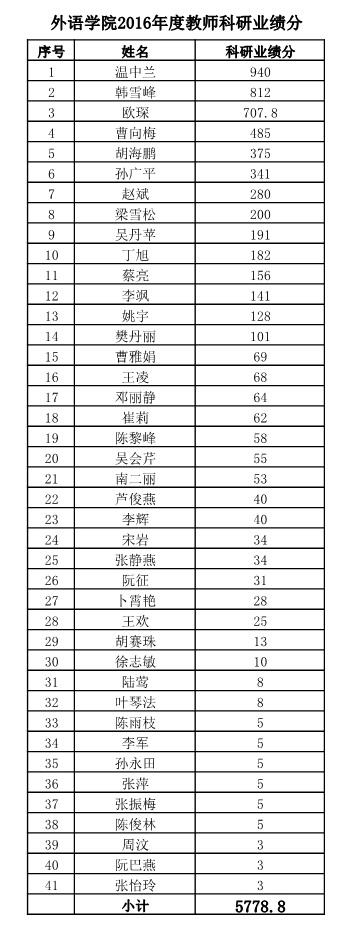 外语学院2016年度科研业绩分已计算完成,之前公示期于1月6日截止,该表格于1月9日上报学校科研处。